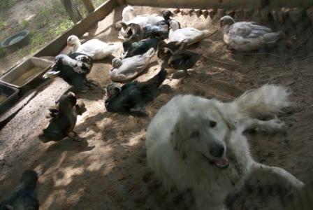 Spenser, one of our Great Pyrs, bonding with a group of adopted Muscovy and Mallard ducks.