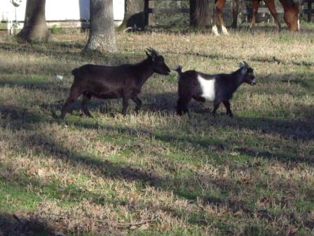 Mama goat and Oreo: Several months after adopting a female black pygmy goat, we received a nice surprise when she gave birth to little Oreo.